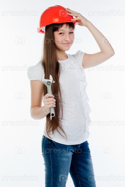 Красивая девочка в строительном шлеме и с инструментами