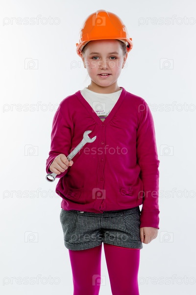 Красивая девочка в строительном шлеме и с инструментами
