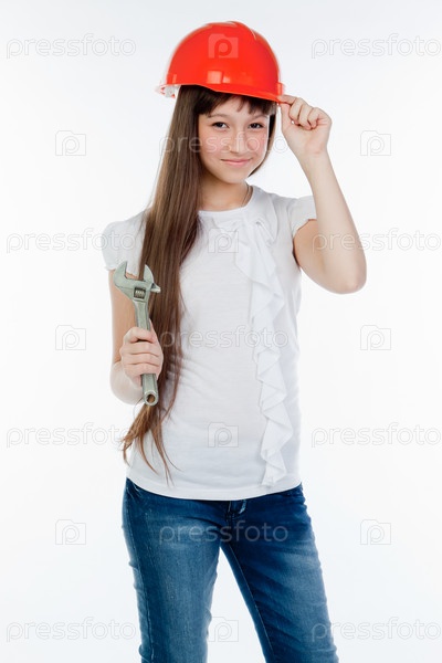 Красивая девочка в строительном шлеме и с инструментами