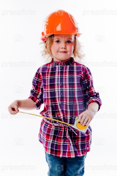 Красивая девочка в строительном шлеме и с инструментами