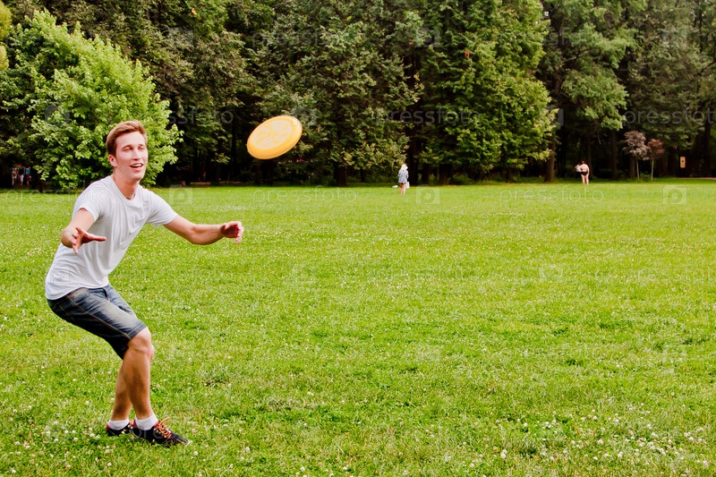 Молодой красивый мужчина играет во фрисби в летнем парке
