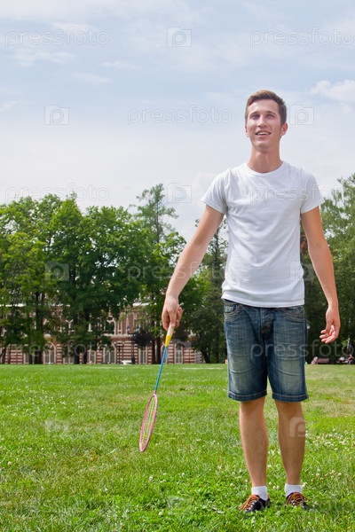 Молодой и красивый мужчина играет в бадминтон в летнем парке