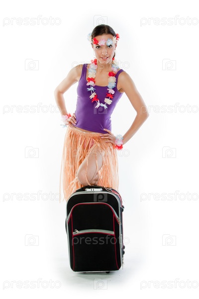 Красивая девушка в гавайском платье с чемоданом