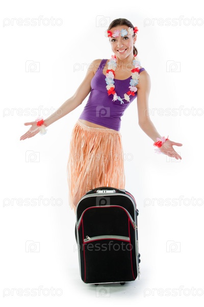 Красивая девушка в гавайском платье с чемоданом
