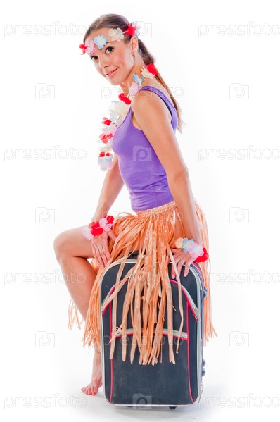 Красивая девушка в гавайском платье с чемоданом