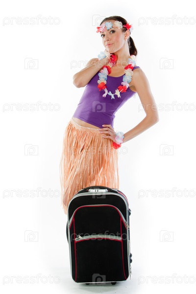 Красивая девушка в гавайском платье с чемоданом