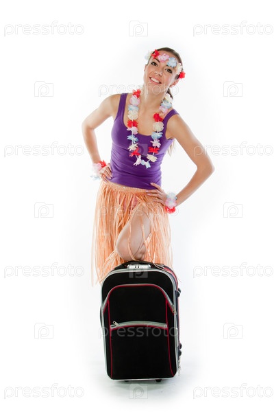 Красивая девушка в гавайском платье с чемоданом