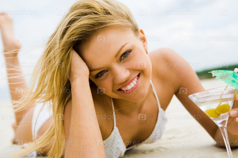 Изображение красивой девушки со стаканом мартини, лежащей на песчаном пляже и смотрящей в камеру