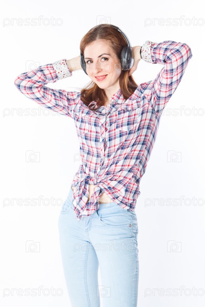 Красивая девушка слушает музыку в наушниках