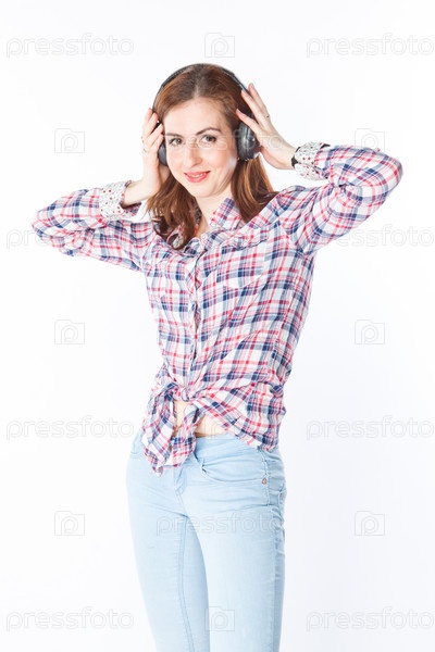 Красивая девушка слушает музыку в наушниках