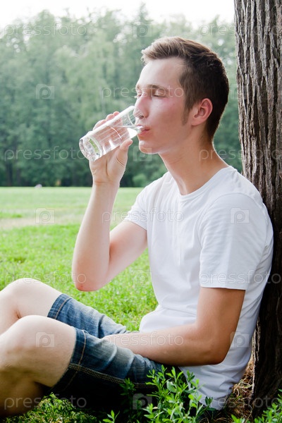 Молодой красивый мужчина пьет воду в парке