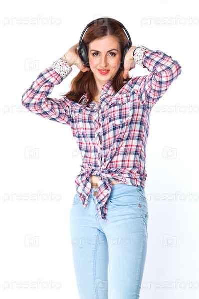Красивая девушка слушает музыку в наушниках