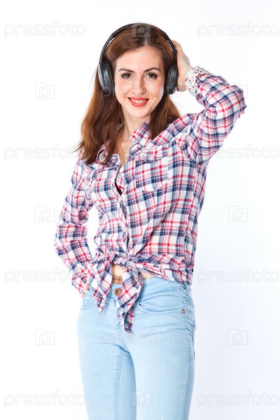 Красивая девушка слушает музыку в наушниках