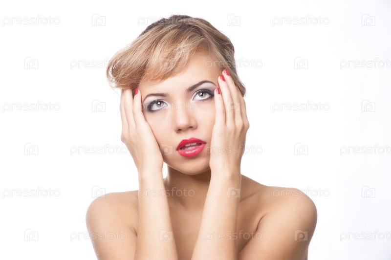 Портрет симпатичной девушки, испытывающей головную боль, на белом фоне