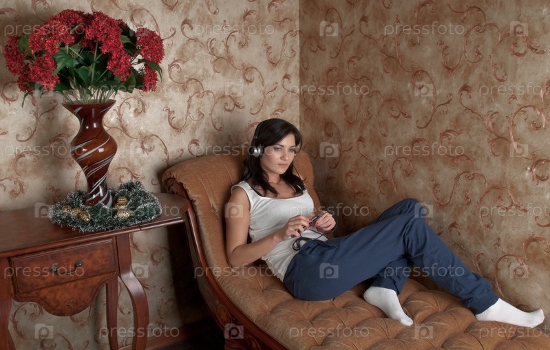 Молодая и красивая женщина слушает музыку в наушниках