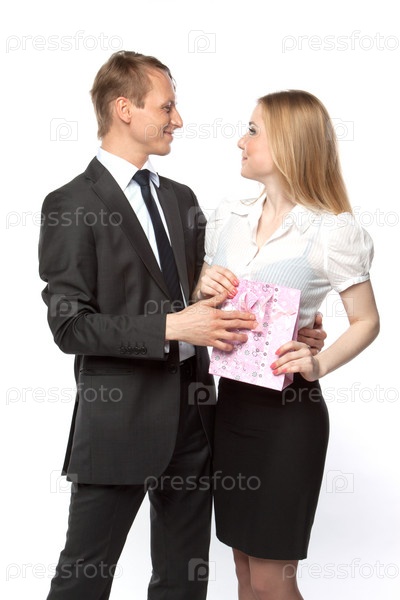 Мужчина дарит подарок красивой женщине