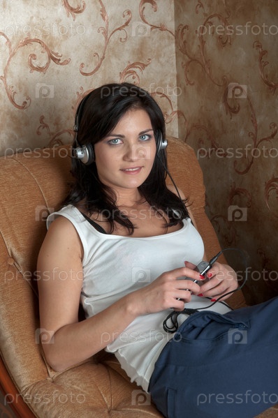 Молодая и красивая женщина слушает музыку в наушниках