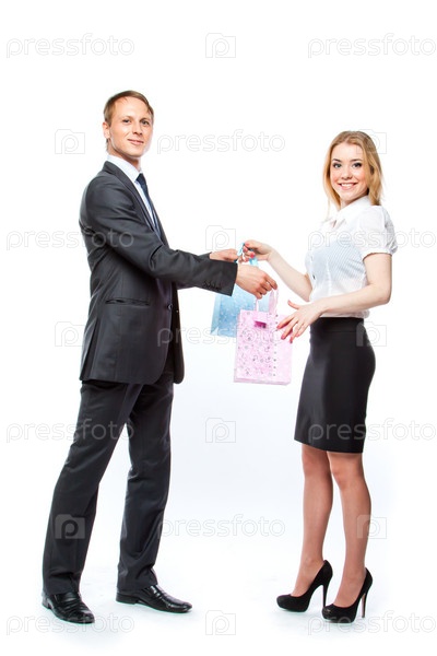 Мужчина дарит подарок красивой женщине
