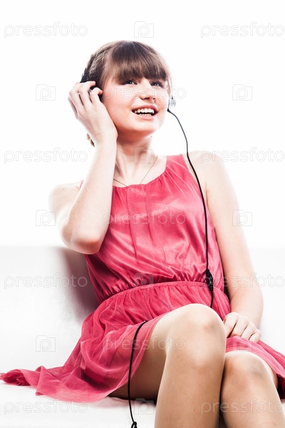Молодая и красивая женщина слушает музыку в наушниках