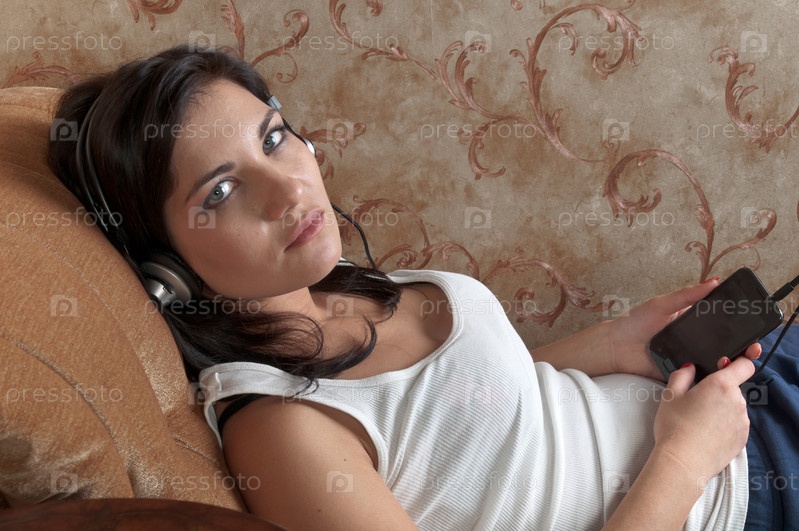 Молодая и красивая женщина слушает музыку в наушниках