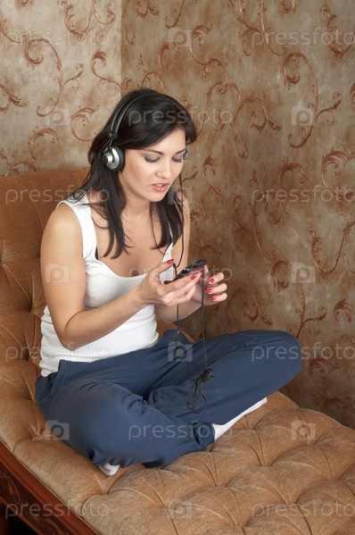 Молодая и красивая женщина слушает музыку в наушниках