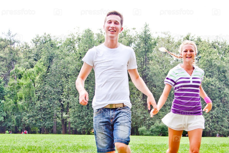 Пара красивых молодых людей прыгает в парке
