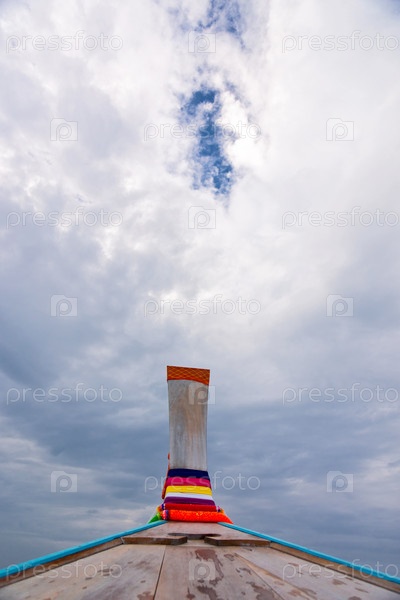 Нос деревянной лодки, украшенной цветными лентами