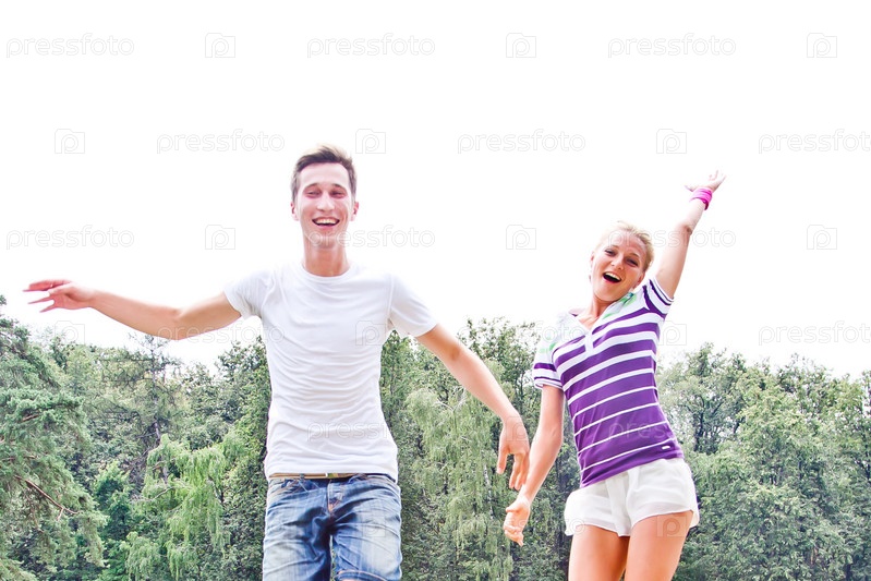 Пара красивых молодых людей прыгает в парке