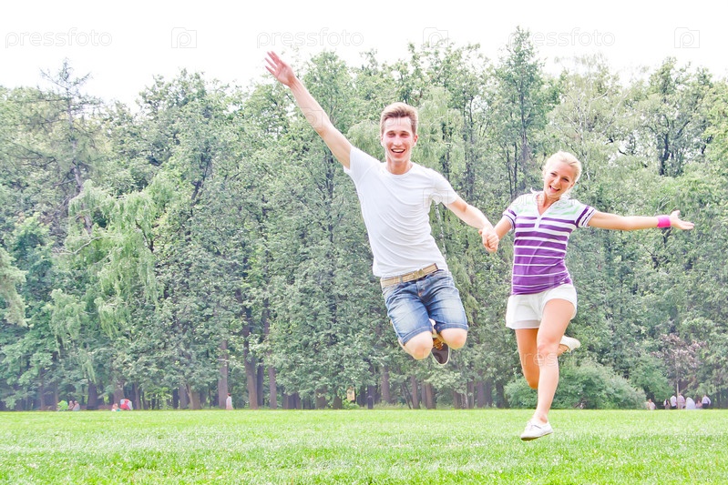 Пара красивых молодых людей прыгает в парке