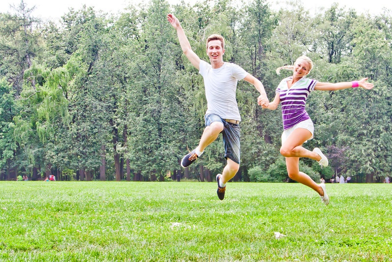 Пара красивых молодых людей прыгает в парке