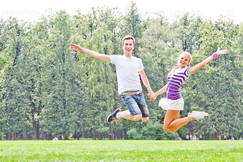Пара красивых молодых людей прыгает в парке