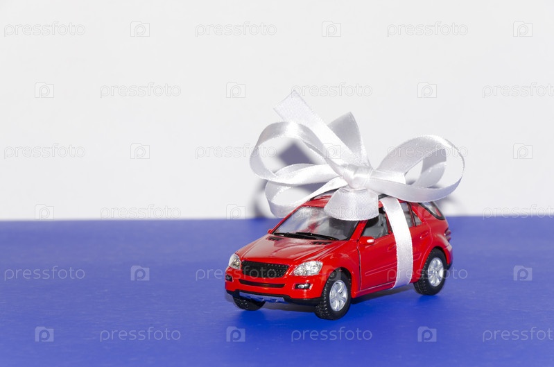 Красный автомобиль, перевязанный белой лентой
