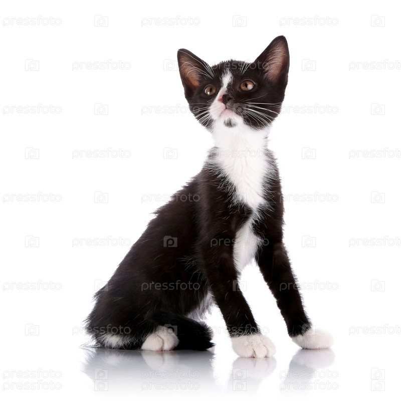 Черно-белый маленький котенок сидит на белом фоне