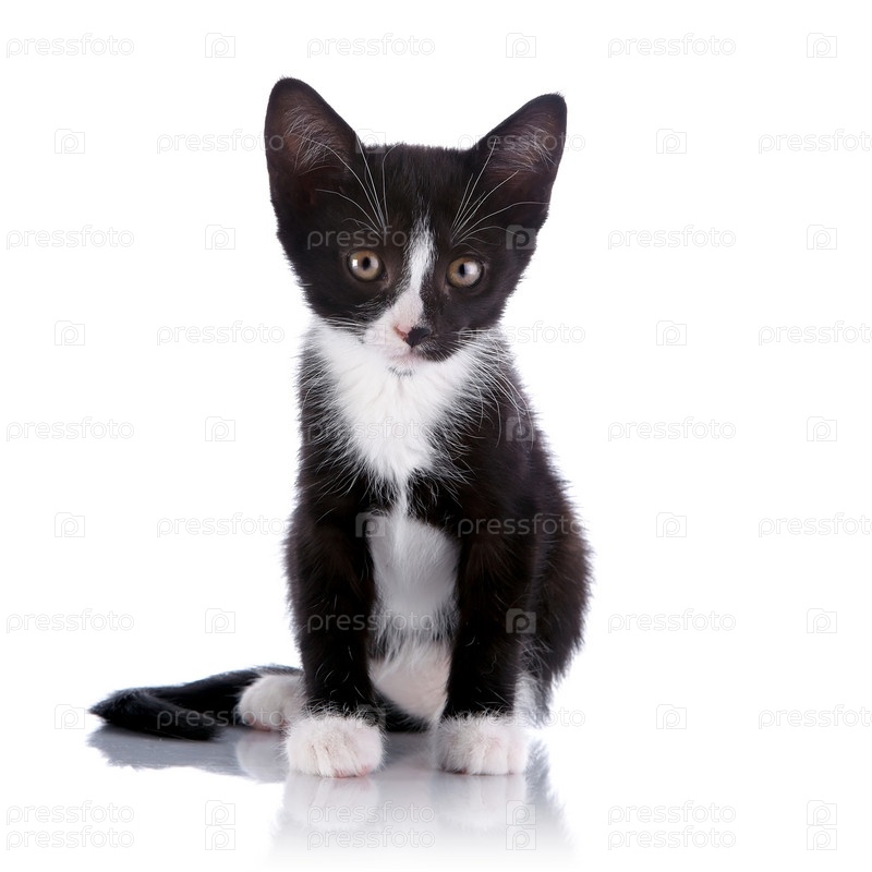 Черно-белый маленький котенок сидит на белом фоне