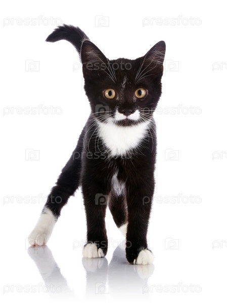 Черно-белый котенок стоит на белом фоне