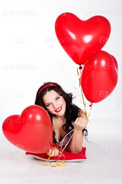 День Святого Валентина. Красивая девушка с красными шарами