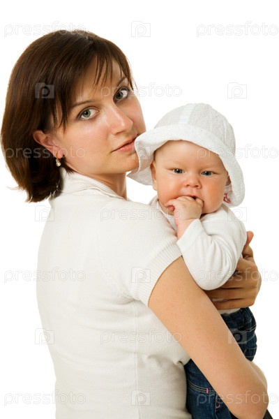 Портрет мамы с маленьким ребенком на руках на белом фоне