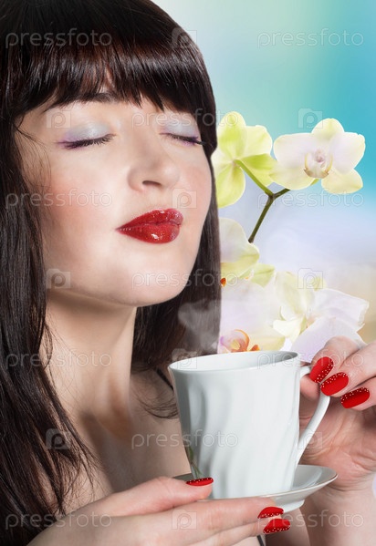 Красивая девушка в бутонах орхидей с чашкой ароматного чая на голубом абстрактном фоне