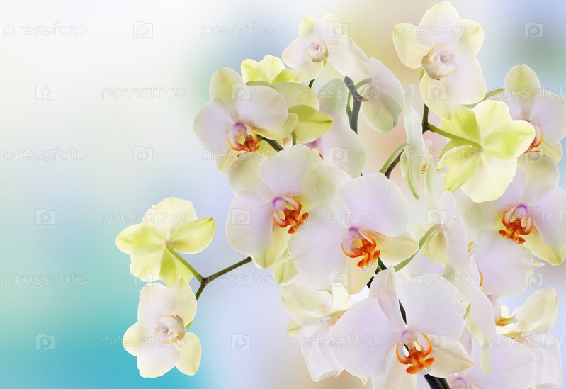Экзотические цветы орхидеи на абстрактном голубом фоне