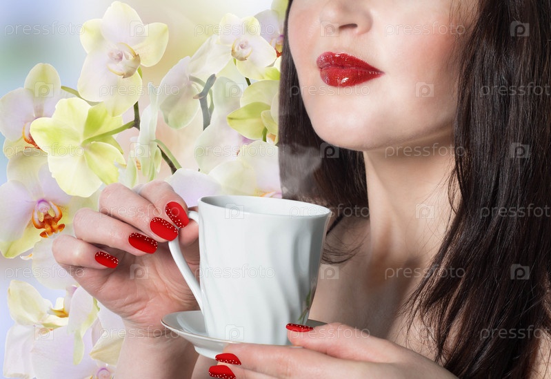 Красивая девушка в бутонах орхидей с чашкой ароматного чая на голубом абстрактном фоне