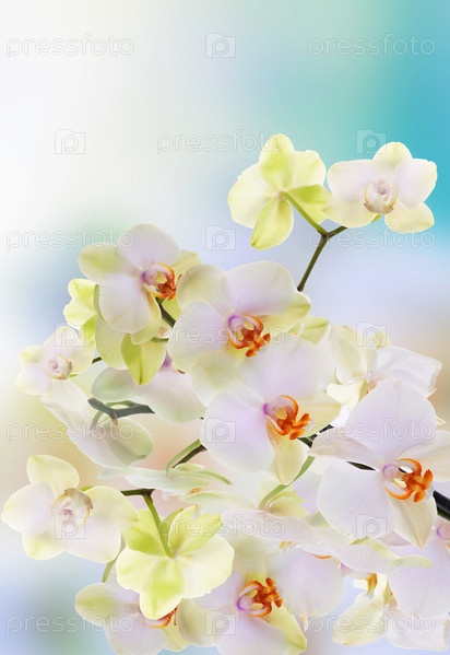 Экзотические цветы орхидеи на абстрактном голубом фоне