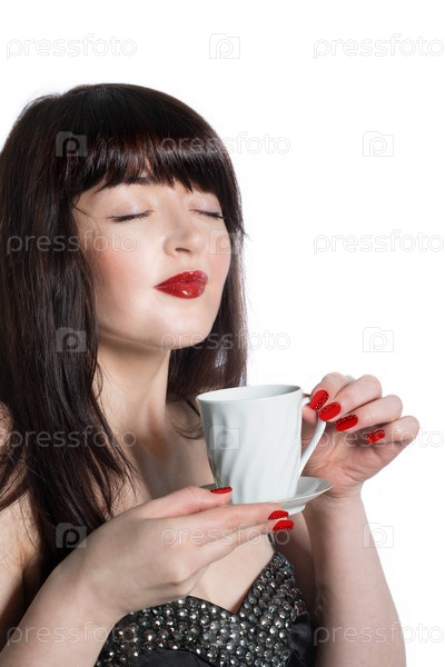 Красивая девушка с чашкой ароматного кофе на белом фоне