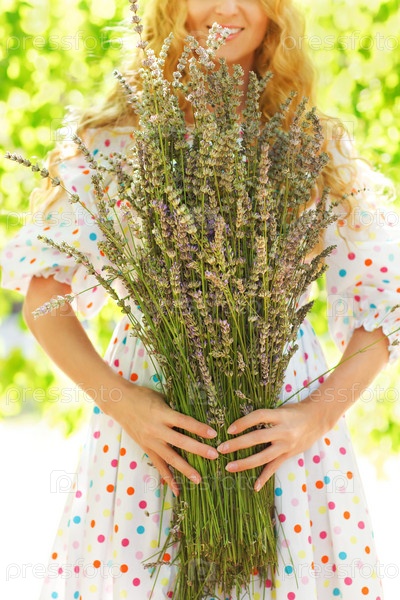 Романтическая женщина с длинными светлыми волосами с букетом лаванды