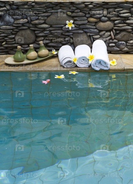 Полотенца и средства для ухода за телом на краю бассейна