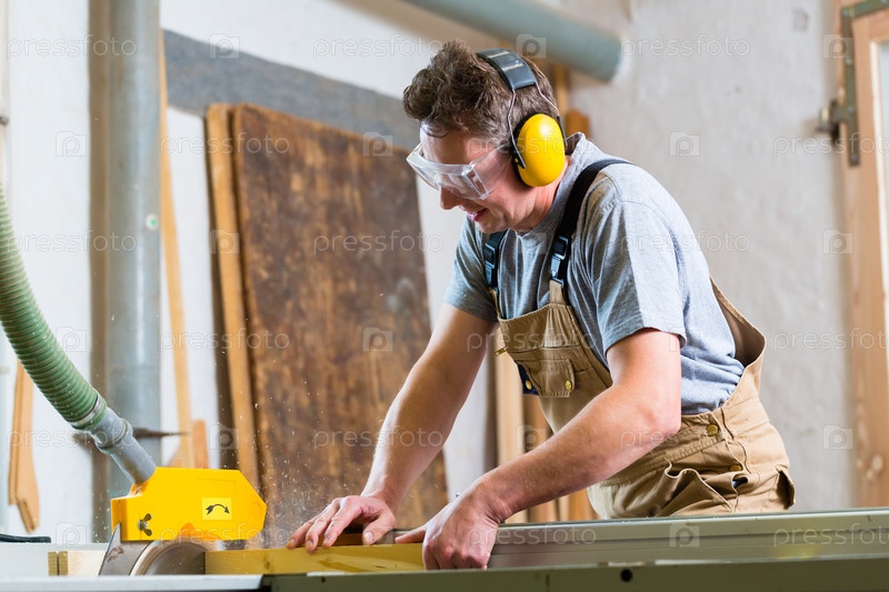 Плотник использует электрическую пилу в мастерской