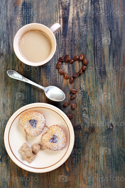 Кофе, печенье и сердце из кофейных зерен