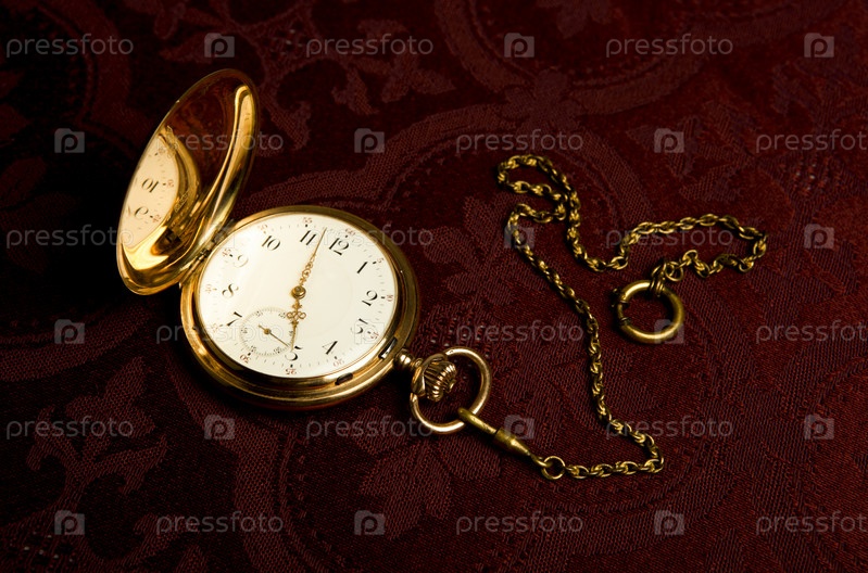 Золотые карманные часы на бордовой ткани
