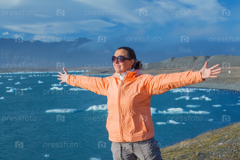 Женщина на фоне айсбергов. Исландия