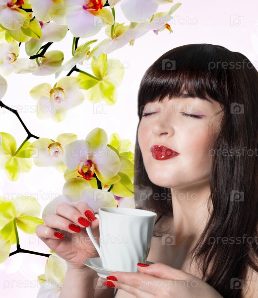 Красивая девушка в бутонах орхидей с чашкой ароматного чая на абстрактном фоне