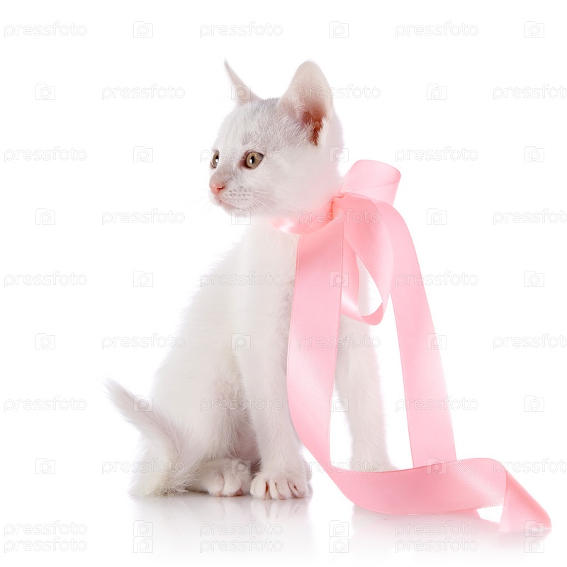 Белый маленький котенок с розовой лентой